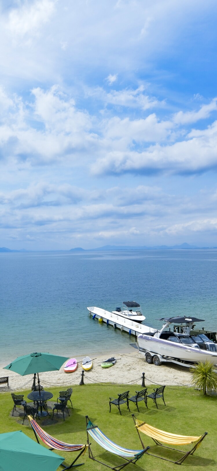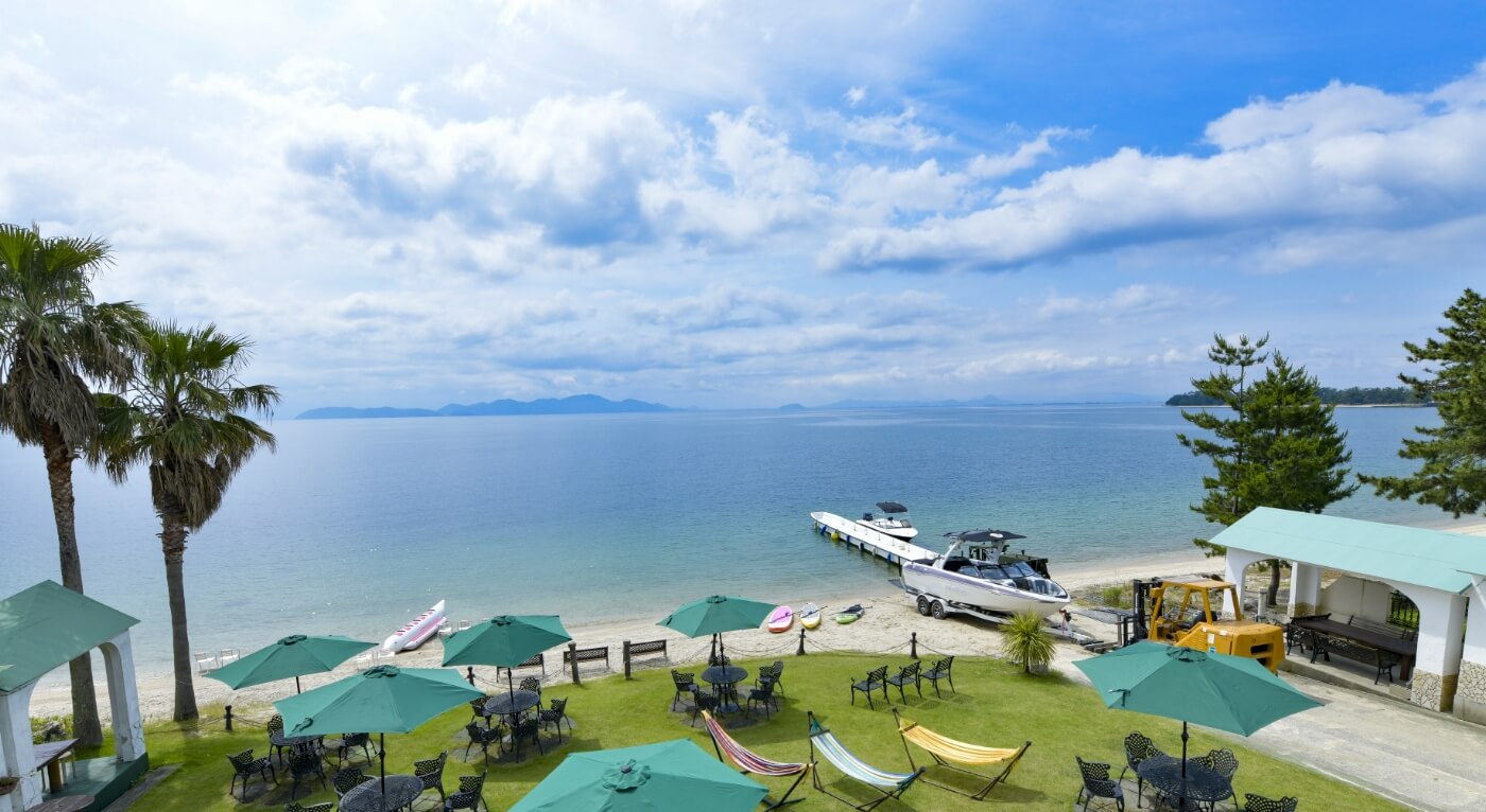 目の前は緑の芝生、そして琵琶湖一美しい水と白い砂浜のプライベートビーチ。マリンスポーツを存分に楽しめる会員制のマリーナに、厳選素材を使用したこだわりの食事が好評のペンションと、琵琶湖の魅力を存分に満喫できる環境が揃っています。